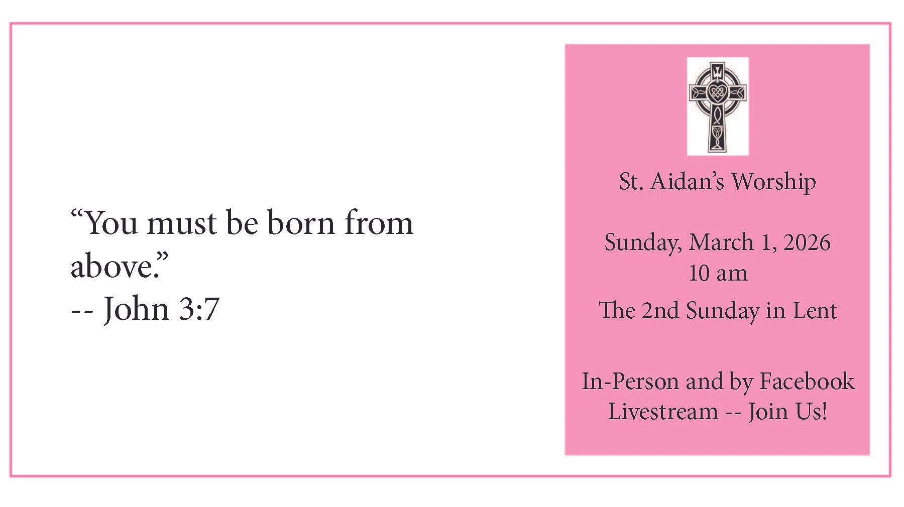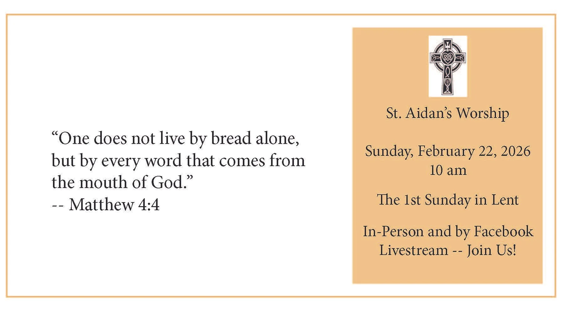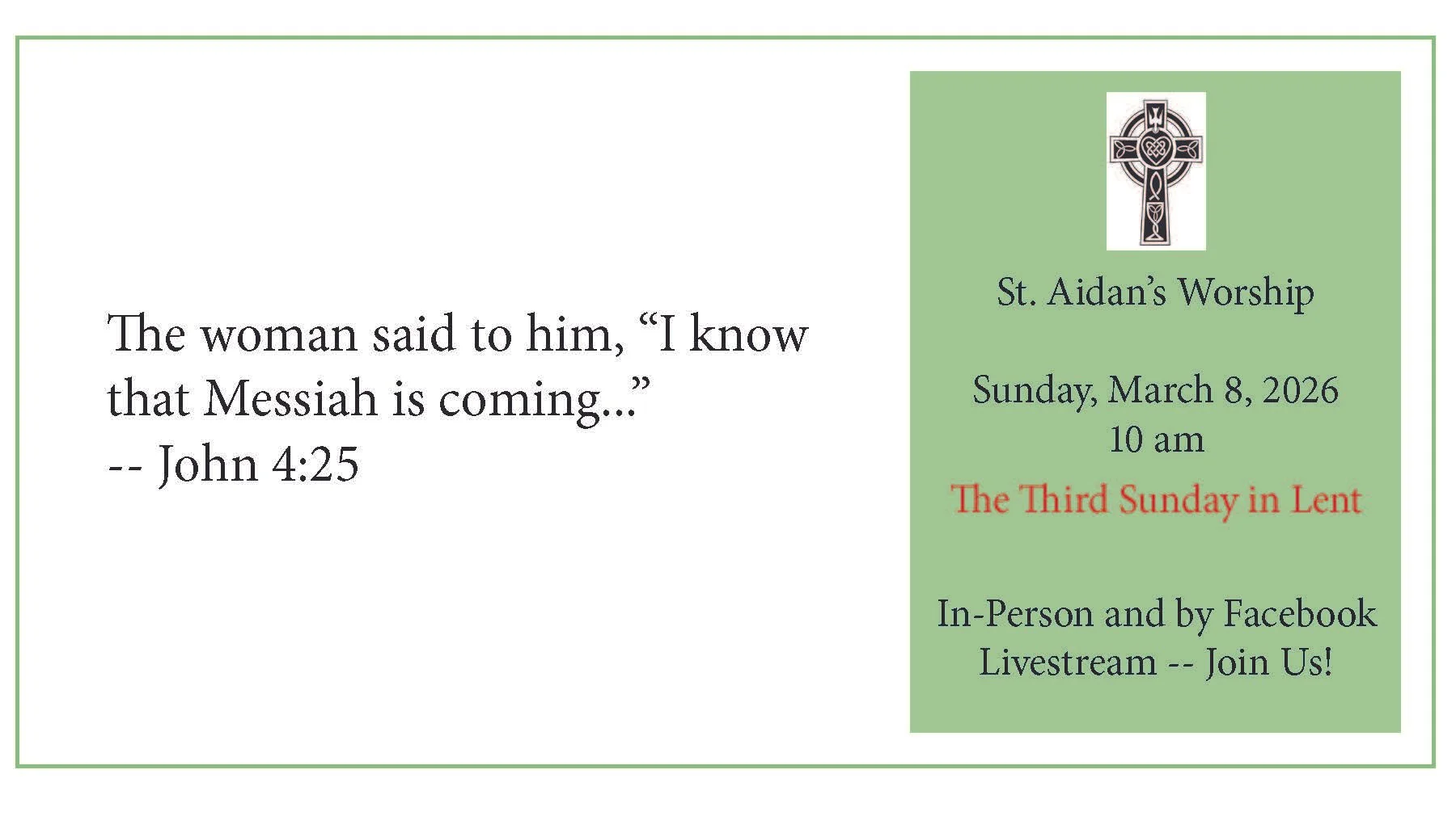 You can view our Facebook livestream if you do or do not have a Facebook account. For those of you without a Facebook account, click on the green livestream link above or in the green box in the upper right of the St. Aidan’s Homepage. When a Facebook account log in window opens, simply close the Facebook account log in window and proceed to viewing the livestream.